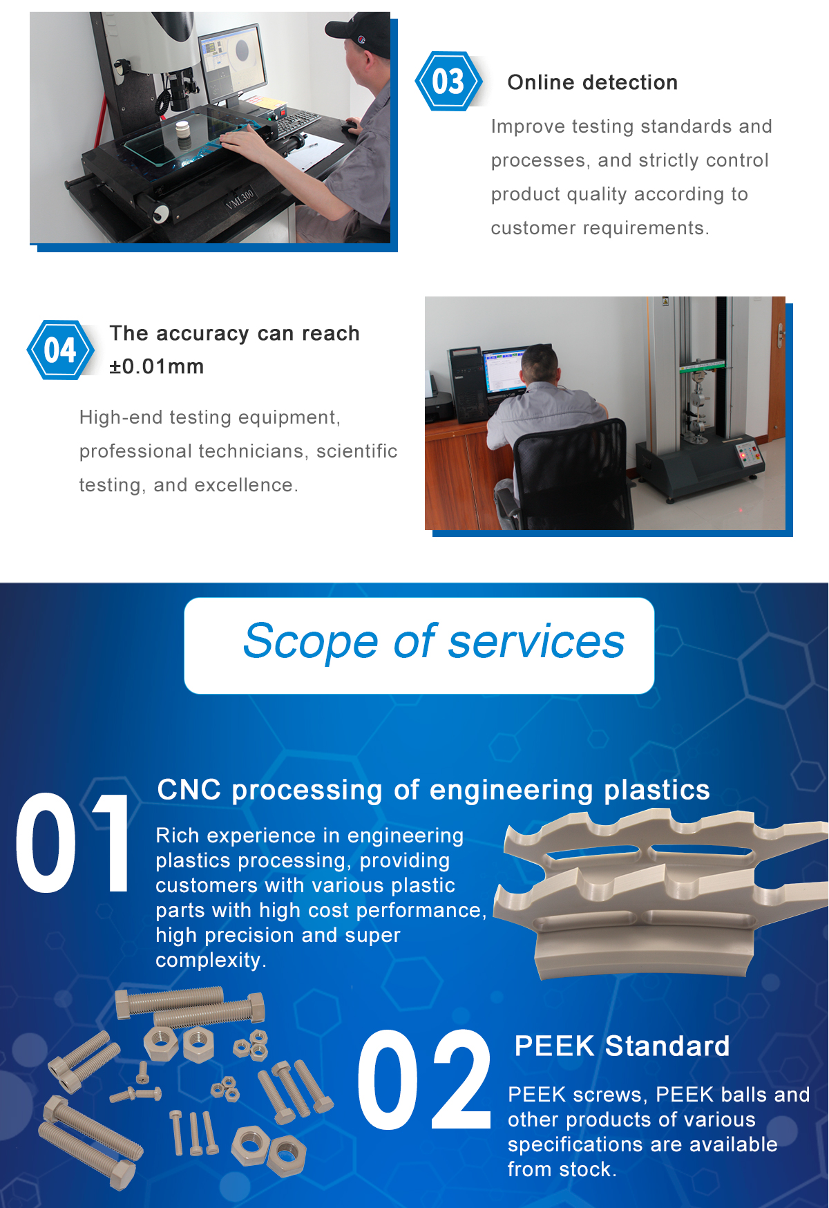 advantages of PEEK gear: reduced noise, low density, light weight, decreased inertial distance, excellent chemical resistance, excellent resistance to grease and automobile fuel, low hygroscopicity, no expansion, weakening strength, high wear resistance, longer service life, better combination with metals and other plastics, reduced costs of injection molding. PEEK has the heat resistance, chemical stability of thermosetting plastics and the processing ability of thermoplastic molding. PEEK has a long-term service temperature of about 260-280℃, a short-term service temperature of 330℃, and high pressure resistance of up to 30MPa. It is a good material for high temperature sealing rings. PEEK products are suitable for all kinds of harsh working conditions in the environment. In addition, PEEK also has excellent properties such as good self-lubrication, easy processing, stable insulation and hydrolysis resistance, which makes it widely used in aerospace, automobile manufacturing, electrical and electronic, medical treatment and food processing and other fields.