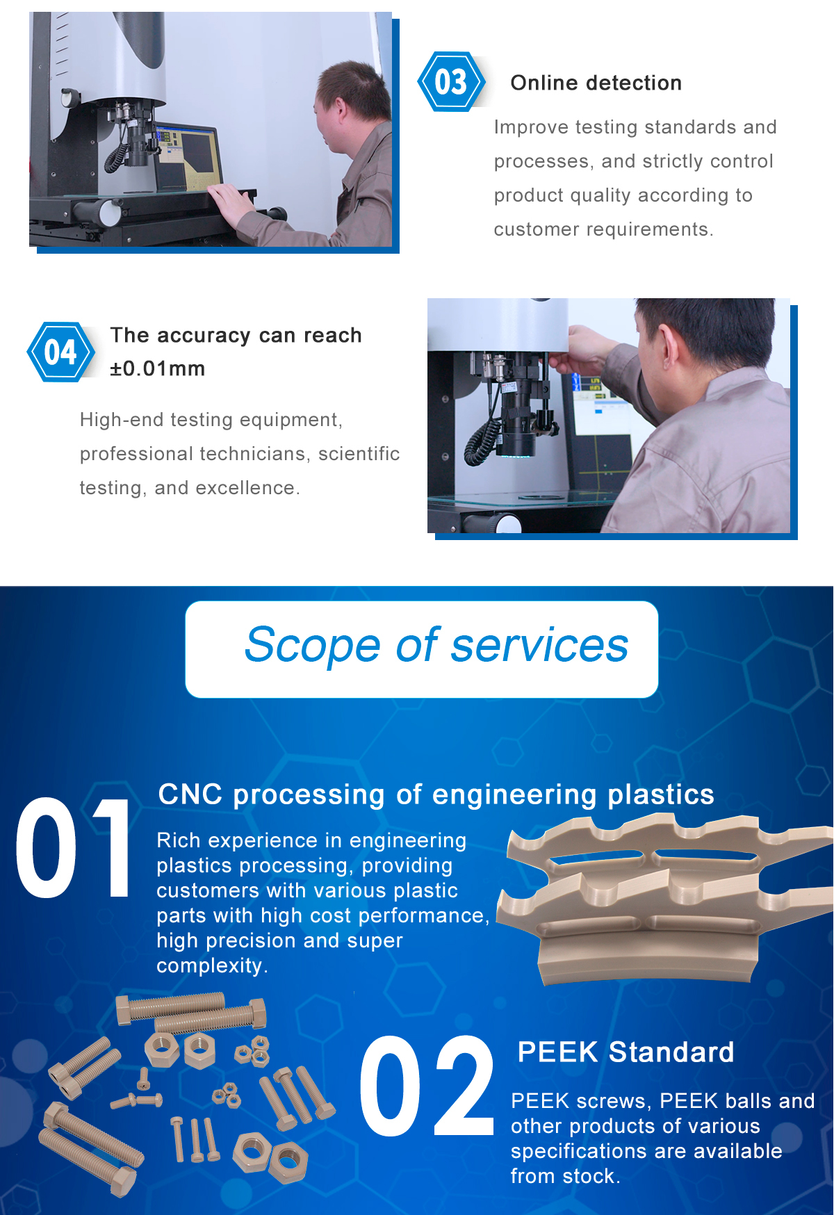 advantages of PEEK gear: reduced noise, low density, light weight, decreased inertial distance, excellent chemical resistance, excellent resistance to grease and automobile fuel, low hygroscopicity, no expansion, weakening strength, high wear resistance, longer service life, better combination with metals and other plastics, reduced costs of injection molding. PEEK has the heat resistance, chemical stability of thermosetting plastics and the processing ability of thermoplastic molding. PEEK has a long-term service temperature of about 260-280℃, a short-term service temperature of 330℃, and high pressure resistance of up to 30MPa. It is a good material for high temperature sealing rings. PEEK products are suitable for all kinds of harsh working conditions in the environment. In addition, PEEK also has excellent properties such as good self-lubrication, easy processing, stable insulation and hydrolysis resistance, which makes it widely used in aerospace, automobile manufacturing, electrical and electronic, medical treatment and food processing and other fields.