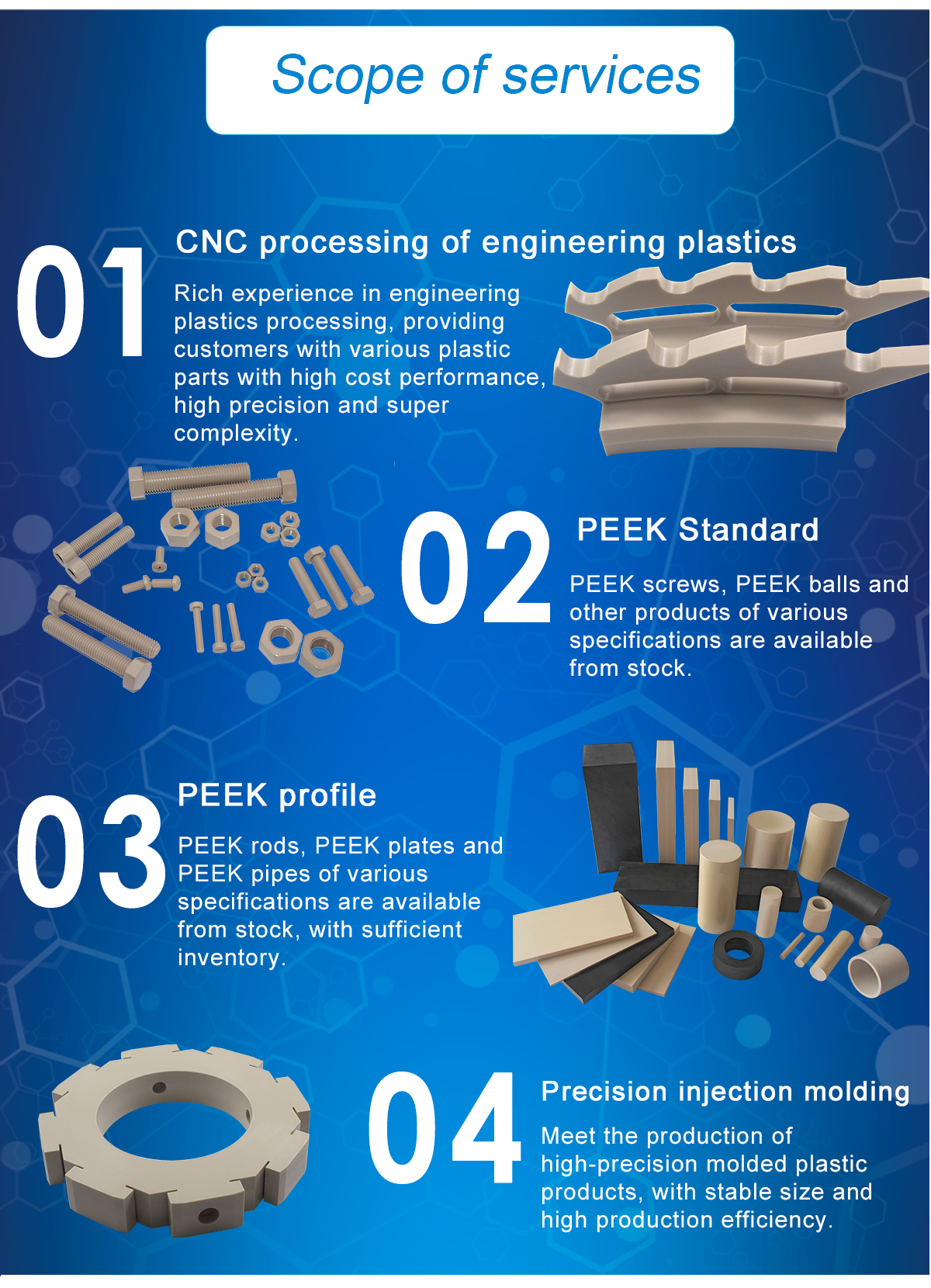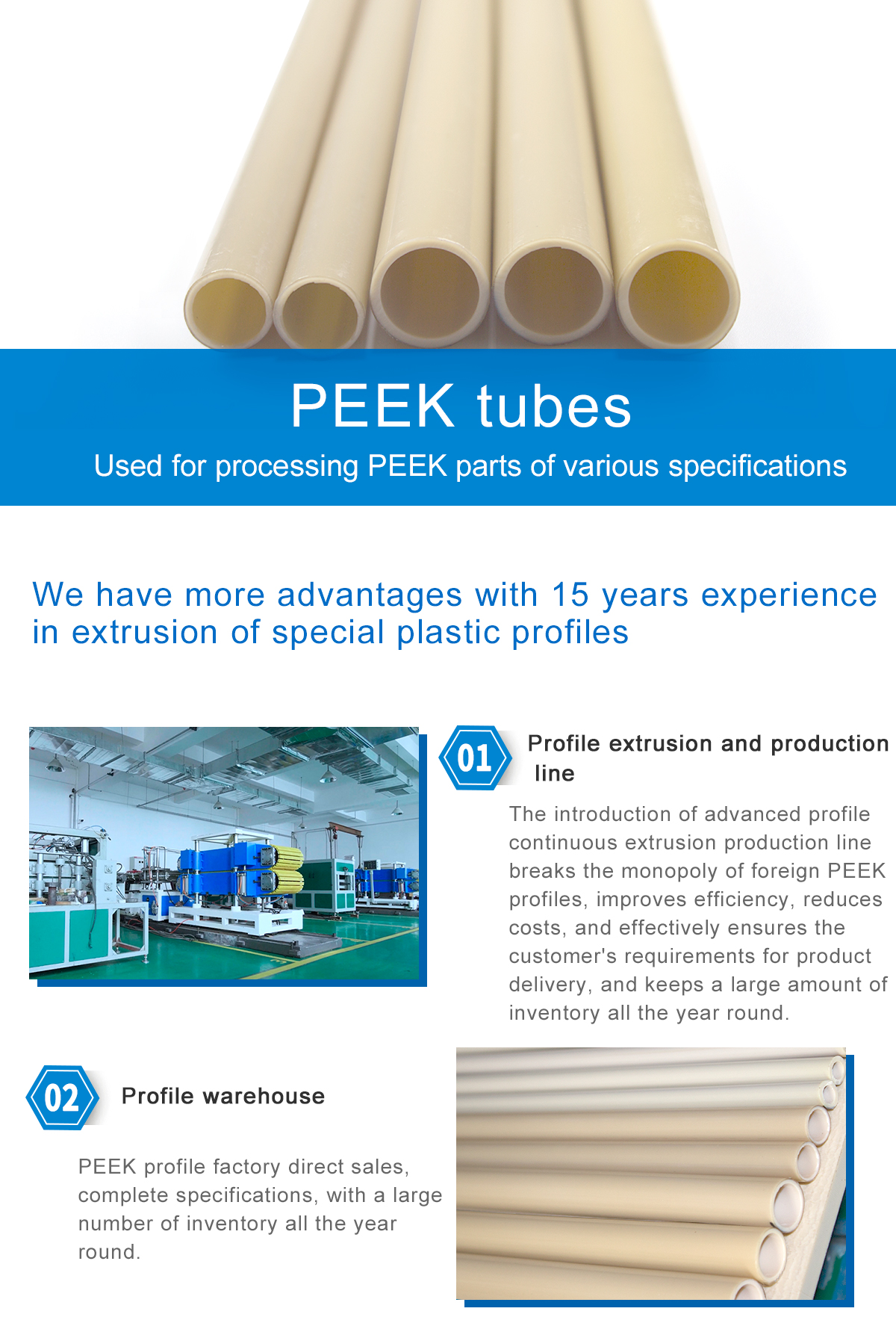 Nanjing Shousu has been focusing on PEEK production and processing for many years, and has the ability to produce PEEK pipes and PEEK rings of different sizes. We produce PEEK tubes and PEEK rings by extrusion molding, compression molding, injection molding and mechanical molding. We can customize the sizes of PEEK tubes and PEEK rings according to the customer's requirements.