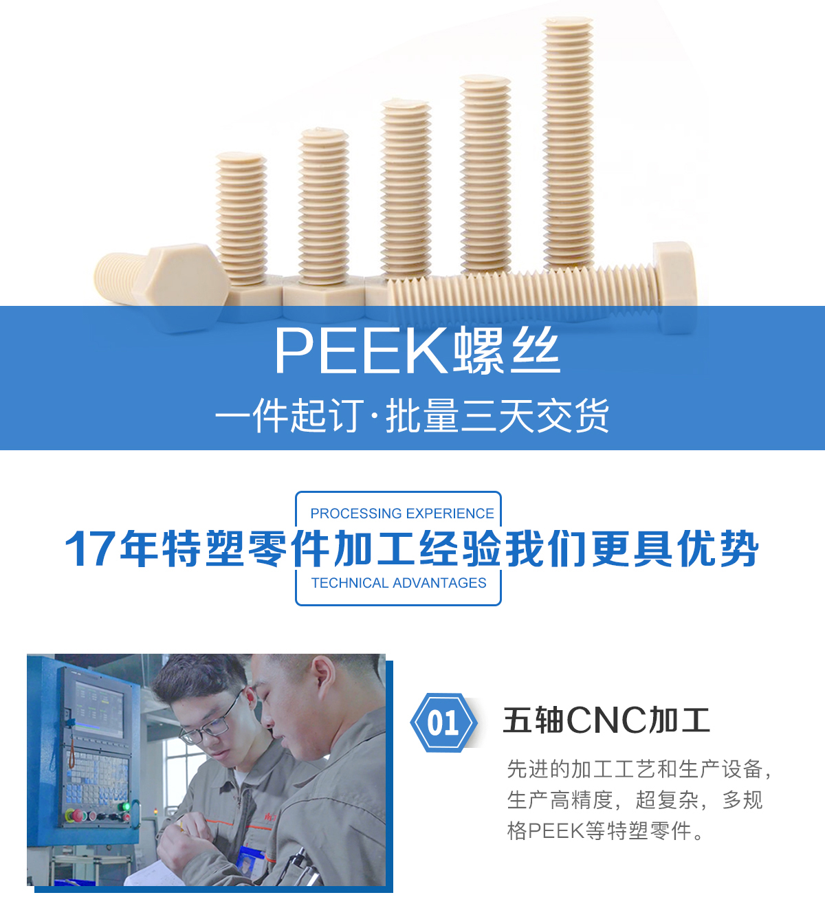 PEEK螺丝可以采用注射工艺,一次成型,加工成本低、有价格优势;比金属螺丝更耐腐蚀;永不生锈;重量轻;耐高温;电性能优异;耐辐照。常年备有大量库存。南京首塑生产以下规格的PEEK螺丝: