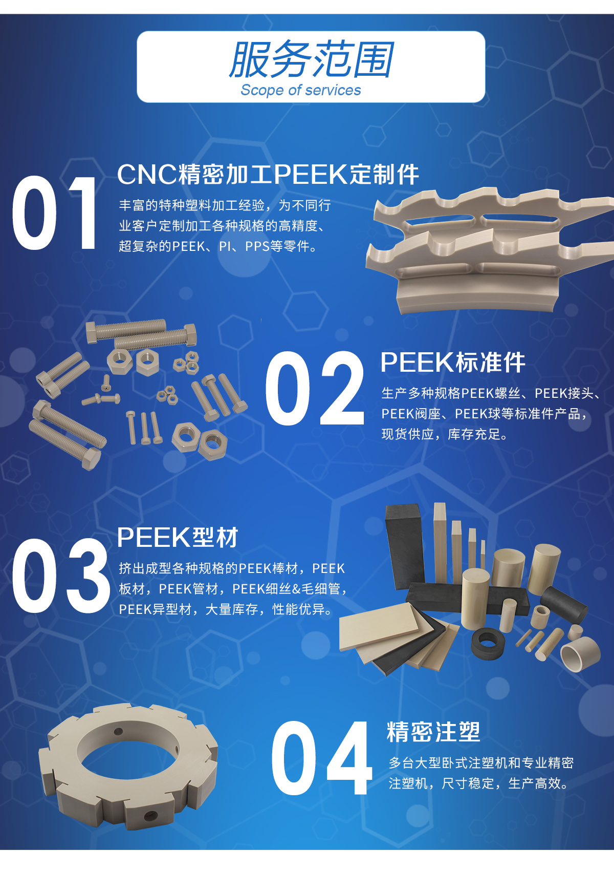 PEEK密封环性能好,尺寸稳定,规格大小可以定制;PEEK密封环耐高温,耐磨损,机械性能强。PEEK材质介绍:耐高温PEEK具有较高的玻璃化转变温度和熔点(334℃),这是它可在有耐热性要求的用途中可靠应用的理由之一。其负载热变型温度高达316℃,连续使用温度为260℃。 PEEK在高性能聚合物中具有其它通用塑料无法比拟非常优异的综合性能,具有适用各种苛刻环境的卓越性能,已成功广泛应用于航空航天、汽车、电子半导体、机电等各个行业中要求比较苛刻的场合。是用户进行新品开发,提高产品使用寿命及可靠性材料。